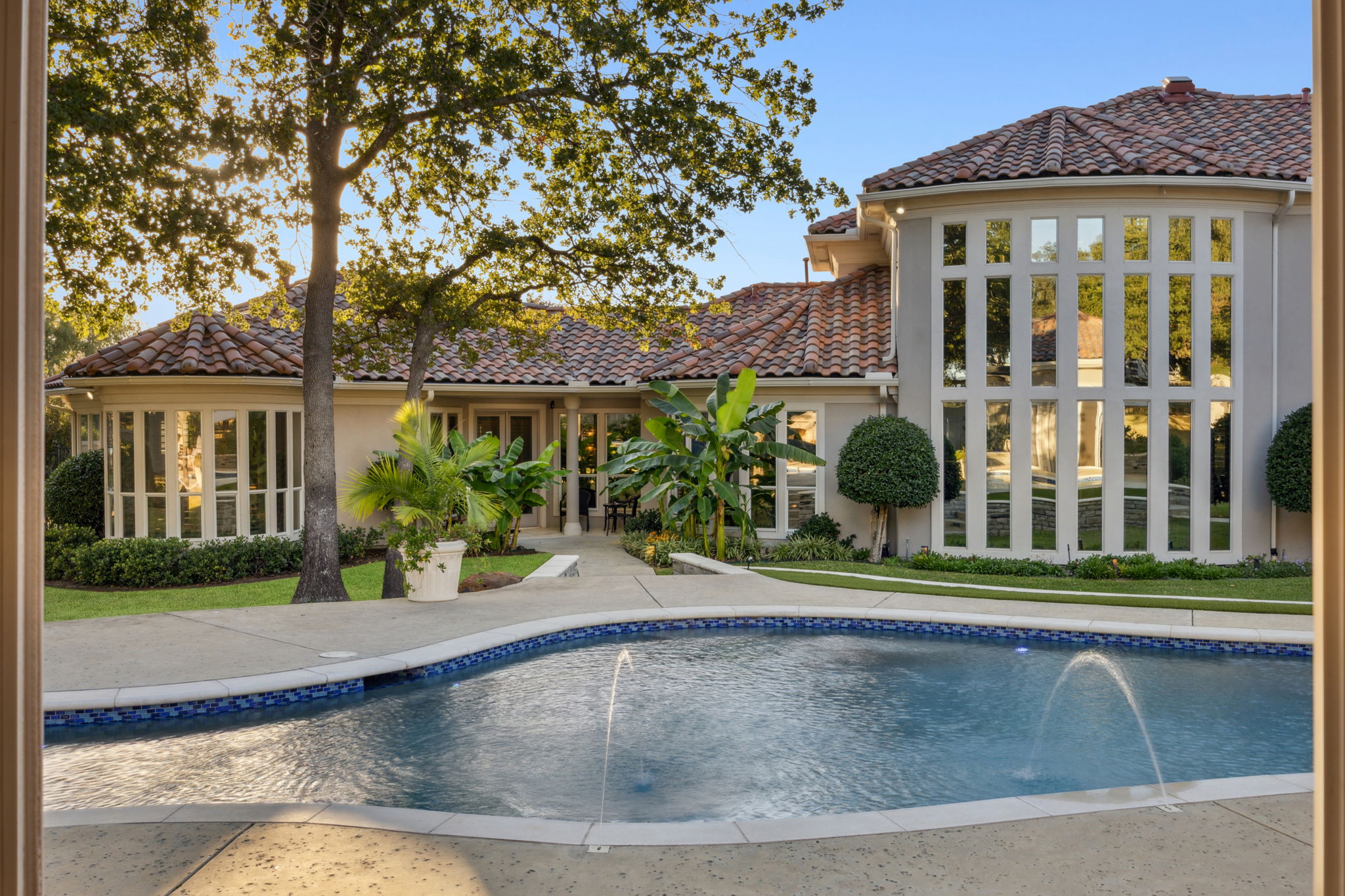 Experience luxury living in the prestigious 24 hr guard gated golf community The Estates at Tour 18 that feeds into exemplary Argyle ISD. With over 7,100+ sq ft of custom construction featuring the extraordinary recent cabana, exterior stone FP, spa and gorgeous hardscape and gardens. Perfectly positioned on a rare corner and cul-de-sac 2 acre+ lot that combines refined design, smart home technology and tranquil year round indoor-outdoor living. Step through double glass + iron doors into a dramatic entry with soaring cathedral ceilings, a striking curved staircase and floor to ceiling windows. The open concept dining area connects to a butler’s pantry and walk-in food pantry with a sleek pocket door and temperature-controlled wine room. The gourmet kitchen features custom wood cabinetry, concealed refrigerator, pot filler, stainless appliances, central island, and bar seating that flows into the breakfast nook and family room with a fireplace, media wall and walk-in bar. The large executive office showcases handsome floor-to-ceiling built-ins with panoramic windows of the backyard. The private primary retreat features extra large sitting area, dual sided fireplace, coffee bar, wellness room, dual vanities, soaking tub, glass-enclosed shower, and an expansive walk-in closet with additional large cedar closet. Upstairs includes spacious secondary bedsuites, a game room with balcony, kitchenette and bar, allowing flexible living spaces. The next level resort-style backyard showcases the meandering resort pool, extra large separate stone spa, freestanding stone FP, and the recent luxury cabana equipped with full kitchen, separate dining room and living space- grill, large stone island bar, dishwasher, ice maker, warming oven, and refrigerator. Finished with a Spanish tile roof, gated motor court, extensive sound and security systems, additional parking for events + five-car garage. An amazing estate and well priced opportunity to own in the coveted golf community.